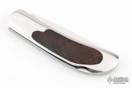 This knife by Eldon Peterson features a hand rub satin finished drop point blade with nail nick. The handle has a mirror polished stainless steel frame with walnut burl inlays. Nice lockup and blade seating. Comes with a leather zippered case. Has some very light scratches, otherwise excellent condition.