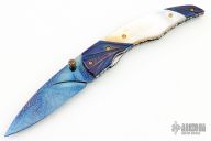 This linerlock features a blued mosaic Damascus blade with single fileworked brass thumbstud with ruby inset. The handle has carved and blued Damascus bolsters, mother of pearl scales, fileworked stainless steel liners, fileworked and blued mosaic Damascus backspacer, gold plated screws. Nice detent, lockup and blade seating. Comes with a leather belt sheath. Excellent condition.