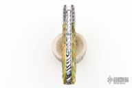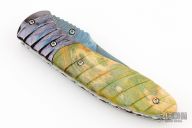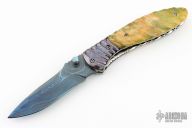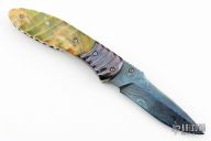 This linerlock features a blued Damascus blade with single fileworked brass thumbstud with turquoise inset. The handle has carved and blued Damascus bolsters, carved burl wood scales, fileworked stainless steel liners, fileworked stainless steel backspacer with teal stone inlays, fileworked screws. Has some vertical blade play. Comes with a zippered case. Excellent condition.