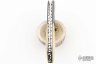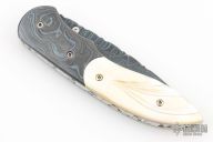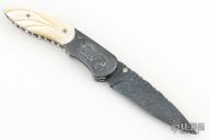 This linerlock features a blued Damascus blade with fileworked spine, single thumbstud with diamond inset. The handle has blued Damascus bolsters, carved gold lip pearl scales, fileworked stainless steel liners, fileworked stainless steel backspacer. Nice lockup and blade seating. Comes with a zippered case. Excellent condition.