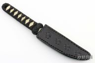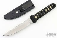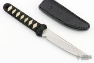 This Tanto by Mickey Yurco features a satin finished blade with .175" blade thickness and .920" blade depth. The handle has black cord wrap over white ray skin with turkshead knot guard. Comes with a leather sheath. Has a couple light scuffs, otherwise excellent condition.