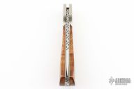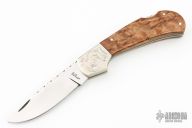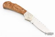This lockback by Dick Dorough features a high polished drop point blade with a nail nick. The handle has engraved dovetailed sterling silver bolsters, wood scales, Titanium liners and fileworked steel backspacer. Nice lockup and blade seating. Has some light scuffs and scratches, great condition otherwise.