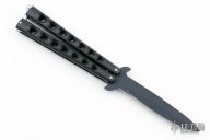This balisong by Compass Industries features a black blade and black coated handles with a chrome plated T-latch. Comes with original box. Has some light scuffs, otherwise excellent condition.