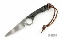 This Ringed Airkat by Dwaine Carrillo features a tiger stripe finished blade with a notched thumbrest, .152" blade stock and .906" blade depth, full tang construction. Hollow ground blade. The handle has black paper micarta scales with black screws. Has some light staining on the blade, otherwise excellent condition.  Comes with brown leather sheath with built in ceramic sharpening stone and an additional pocket with a Carrillo Guthook. The Guthook is also tiger stripe finished with notches on the tang. Has some scuffs, otherwise excellent condition.