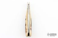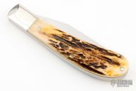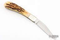This vintage slipjoint by Tony Bose features a hand rub satin finished blade with a nail nick.  The handle has pinched nickel silver bolsters, stag covers, nickel silver liners, stainless steel spring. Has a half stop, flush in the open and closed positions. Includes a zippered case. Has a few light scratches, otherwise excellent condition.