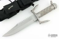 This is an early Buckmaster 184, made prior to full blade being marked with BUCKMASTER and while it was patent pending, hard to find. Has a clip point blade with serrated top edge and saw teeth on spine, .287" blade stock and 1.488" blade depth. The handle has a stainless steel guard, knurled handle and removable butt cap. Comes with original sheath. Includes original grappling hooks that are stored in the sheath along with a compass. Has a couple light scuffs, otherwise excellent condition. Made between November 1984 - July 1985.