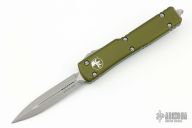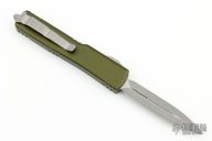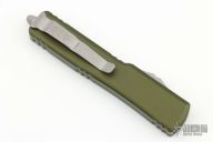 This UTX-70 OTF automatic by Microtech features an apocalyptic finished blade with a standard edges. The handle has a green aluminum frame with blasted stainless steel tip down clip. Serial number 30373 and dated 01/2022. Comes with original box and papers. Excellent condition.
