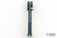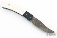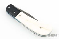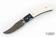 This knife by Jake Elenbaas features a clip point Alabama Damascus blade with single thumbstud with pink stone inlay. The handle has black G-10 bolsters, front and rear, mammoth ivory scales, anodized titanium liners with jeweled interiors and a white G-10 backspacer. Nice lockup and blade seating. Comes with COA. New from maker.