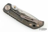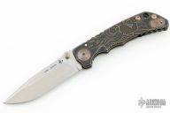 This Harsey framelock folder by Spartan Blades features a stonewash finished drop point blade with dual thumbstuds and a notched thumbrest. The handle has an anodized titanium frame with a laser engraving a tip up titanium clip and filler tab. Has nice detent, lockup, and blade seating. Excellent condition. Comes with original box.