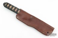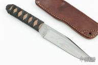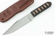 This Knife by Bill Siegle features a satin finished blade with .260" blade stock and 1.334" blade depth, hidden tang construction. The handle has epoxied black cord over white cord wrap. Comes with a brown leather sheath, not original sheath. Has some light scratches, otherwise good condition.