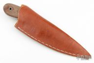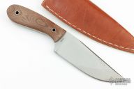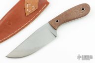 This knife by Bill Siegle features a satin finished blade with visible temper line, .238" blade stock and 1.710" blade depth, full tapered tang construction. The handle has brown canvas micarta scales. Comes with a brown leather sheath. Has some light patina, otherwise excellent condition.