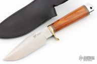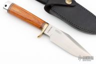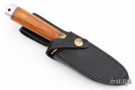 This Classic Blades Trail Guide from Blackjack Knives features a satin finish clip point blade with false top edge, .210" blade stock and 1.37" blade depth, hidden tang construction. The handle is comprised of nickel silver guard with red, white and black spacers, wood handle and an aluminum butt. Includes original leather sheath. Has some scratches and patina, otherwise excellent condition.