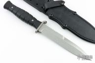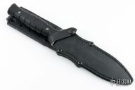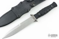 The M320 by Defiant 7 features a stonewashed blade with false top edge and notched thumbrest, .188" blade stock and 1.135" blade depth, hidden tang construction. The handle has a stonewashed titanium guard with a black G-10 grip. Comes with a black leather sheath by Chattanooga Leather Works, and original box. New from maker at the 2024 Blade Show Texas.