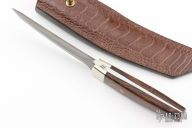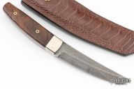 This knife by Jim Ort features a Damascus blade with .207" blade stock and 1.053" blade depth, full tapered tang construction. The handle has Ironwood scales with pinned nickel silver bolsters. Comes with a very nice leather sheath with Ostrich overlay. Has a couple light scuffs and scratches, great condition otherwise.