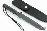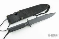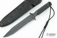 The Project II (clip point blade) was designed in conjunction with Sgt. Karl Lippard, USMC and author of The Warriors - United States Marines. The concept was to fulfill all the features which Sgt. Lippard felt were vital for a knife carried by a Marine. The 7.5 blade (.255" thick at spine) is perfect for chopping, digging and cutting, with sufficient weight up front for maximum strength and ideal balance. The wave serrations on the cutting edge are designed to cut easily through nylon cord or harness. Comes with original black leather sheath, original box and COA dated Sept 27, 1995j. Has some light scuffs, otherwise excellent condition.