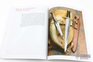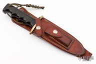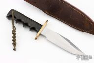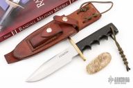 This Model 15 Airman by Randall Made Knives features a clip point blade with a sharpened top edge, .213" blade stock, 1.300" blade depth, full tang construction. The handle has black linen micarta handle with finger grips and a brass guard. The Model 15 is designed especially for heavy-duty use and to be as nearly indestructible as possible. Comes with a brown leather sheath. Made in 1984 according to the consigner. Has some scratches, has been resharpened, otherwise good condition. This knife comes with a 3rd edition laminated Quick Reference Guide, a muskox horn display stand, and a paperback copy of "Randall Military Models" by Robert E Hunt. Comes with a zippered case.