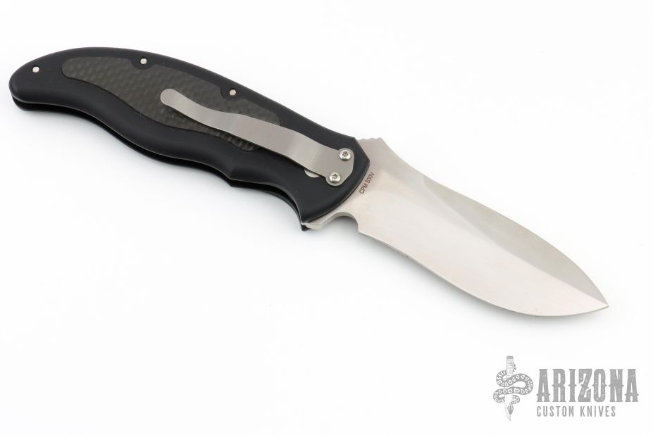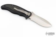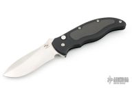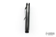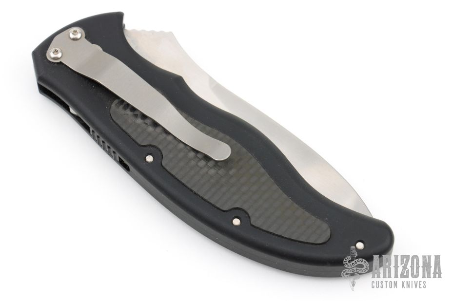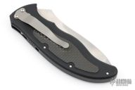 This Latalis automatic from MercWorx features a hand rub satin finished spear point recurve blade with notched thumb ramp and false top edge. The handle has a black aluminum frame with carbon fiber inlays, tip down titanium clip. Safety on handle spine. Excellent condition.