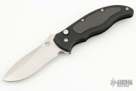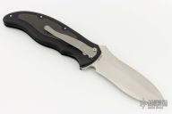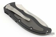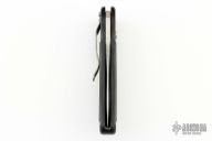 This Latalis automatic from MercWorx features a hand rub satin finished spear point recurve blade with notched thumb ramp and false top edge. The handle has a black aluminum frame with carbon fiber inlays, tip down titanium clip. Safety on handle spine. Excellent condition.