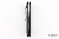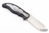This Latalis automatic from MercWorx features a polished and tumbled spear point recurve blade with notched thumb ramp and false top edge. The handle has a black aluminum frame with silver twill inlays, tip down titanium clip. Safety on handle spine. Excellent condition.