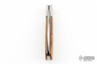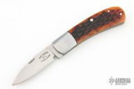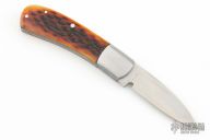 This slipjoint by Jeff Cover features a hand rub satin finished drop point blade with nail nick. The handle has dovetailed and polished stainless steel bolsters, jigged bone covers with stainless pins and stainless steel liners and spring. Has half-stop, flush in the open and closed positions. Comes with zipper case. Has a few light scratches, otherwise excellent condition.