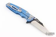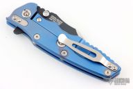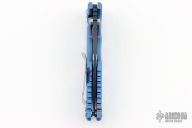 This 0392 from Zero Tolerance is part of their "Factory Custom" series. It features a two tone, bowie style blade with black coated flats, satin finish grinds, swedge, dual thumb studs, notched thumb rest and flipper. The handle is comprised of a blue titanium frame over polished barrel spacers. Tumbled titanium 3 way adjustable pocket clip, has matching filler tab.  Original box and COA. New. #338