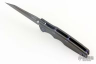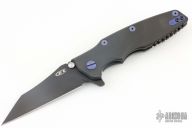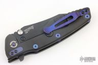 This 0392PURBLKWC from Zero Tolerance is part of their "Factory Custom" series. It features a black wharncliffe style blade with swedge, dual thumb studs, notched thumb rest and flipper. The handle is comprised of a black titanium frame over purple barrel spacers, purple screws and 3 way adjustable pocket clip. Original box and COA. New. S/N of 359.