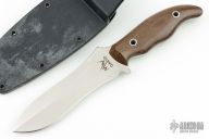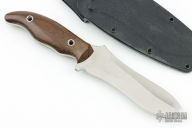This David by Mercworx has a hand rub satin finished blade with false top edge, notched thumbrest, . 186" blade stock and 1.279" blade depth, full tang construction. The handle has micarta scales. Comes with a kydex sheath. Excellent Condition.