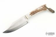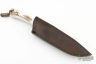 This fixed blade by RJ Smith features a satin finished blade with sharpened top edge, .180" blade thickness and 1.604" blade depth, full tang construction. The handle has nickel silver pins with stag scales. Comes with a brown leather belt sheath. Has light scuffs and scratches, condition otherwise.