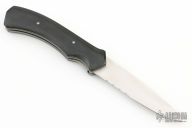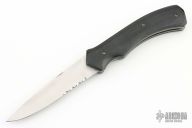 This left-handed Sidewinder II scale-release auto by Rainy Vallotton features a satin finished partially serrated blade with nail nick. The handle has black linen micarta scales, titanium liners, stainless steel backspacer. #80. Nice action, lockup and blade seating. Has a couple light scratches, otherwise excellent condition. Comes with a zippered case.