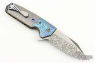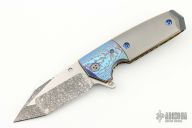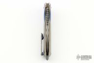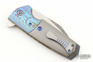 This Tank Flipper from Allen Elishewitz features a black snow finished blade with notched thumbrest and flipper. The handle is comprised of mokuti dovetailed bolsters, bead blast finish titanium scales, textured and anodized titanium liners, zirconium backspacer, satin finish and anodize finish titanium tip up pocket clip with anodize finish screws. Nice detent, lockup and blade seating. Includes a velcro case. Excellent condition.