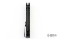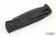 This knife features a black blade with notched thumbrest. The handle has a black aluminum frame with black hardware and black stainless steel tip up clip.  There is a lantern inlaid into the push button.  Comes with original box and papers. New from Maker!