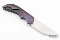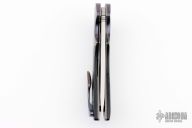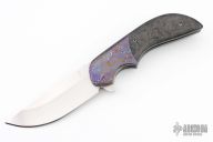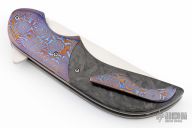 This Barely Legal liner lock flipper by Jeff VanderMeulen features a hand rub satin finished blade with notched thumbrest and flipper. The handle has Chad Nichols MokuTi bolsters and tip up clip with hidden screws, carbon fiber scales, tumble finished titanium liners. Clip and front bolster have hidden screws. Nice detent, lockup and blade seating, rides on IKBS. Comes with zipper case. Has some light scratches, excellent condition otherwise.