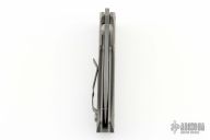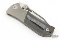 This MTX2 by Microtech features a black partially serrated clip point blade with swedge, carbon fiber inset, dual thumb studs and notched thumbramp. The handle is comprised of blasted titanium bolsters and carbon fiber scales over blasted titanium liners and black polymer backspacer. The titanium tip up clip is positioned for right hand carry. Dated 06/2004 with a S/N of 1048. Comes with original box, sheath and papers. Has a couple very light scuffs, otherwise excellent condition.