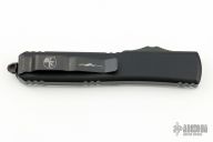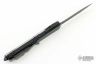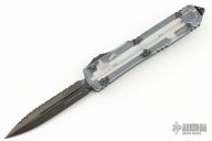This Ultratech OTF automatic features a D/E black blade with full serrations. The handled features a clear synthetic top and an aluminum back complemented by a bead blasted stainless steel clip. Glass breaker. Serial number 013 and dated 11/2022. Includes the original box and papers. Has a light scuff on the clip, excellent condition.