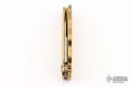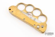 This "Confederate Son" Prototype by Rob Dalton is a set of knuckles with a side opening automatic blade on the thumb side. Dagger blade with a false top edge.  1" diameter finger holes. Made of brass for that heavy duty feel with Confederate Flag inlay. Perfect function. Has some light scratches and patina on handle, otherwise excellent condition. Marked "Proto" on blade.