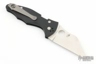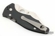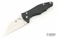 This Yojimbo 2 by Spyderco features a satin finished wharncliffe blade with thumbhole. The handle has a black G-10 frame with stainless steel liners, lock is on the spine of handle. Attached 4-way reversible deep carry titanium clip. Nice detent, lockup and blade seating. Comes with original box and papers. Excellent condition. Knife Center Exclusive.
