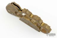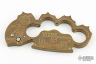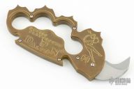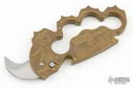 This Prototype "Devil's Playground" auto knuckle by Rob Dalton is a set of knuckles with a small claw automatic blade on the thumb side. 1 1/4" cutting edge.  1" diameter finger holes. Made of brass for that heavy-duty feel. Perfect function. Has some patina, otherwise excellent condition.