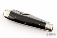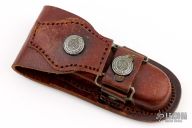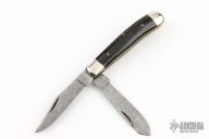 This slipjoint features two Damascus blades with nail nicks. The handle has nickel silver bolsters, buffalo horn covers, brass liners and steel springs. Comes with a brown leather sheath. Has a few light scratches, otherwise excellent condition.