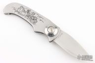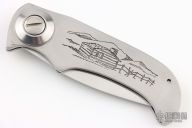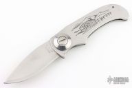 This Swing Lock by Parker Cutlery Company features a satin finished blade with a stainless steel handle. The handle seperates at the butt and swings around to open the knife. Has some patina and scratches, otherwise good condition. Comes with a black nylon sheath.