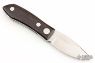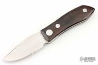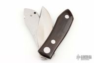 This Barry Wood design swing lock folder features a satin finish blade and satin finish stainless steel frame with wood scales. This is a unique scissor opening folder, which when the blade is fully open and locked in place is almost a fixed blade knife. The handle is nicely contoured for a comfortable grip. Opening is accomplished by lighting pressing down and outward at the rear indentation on the spine, which releases the locking pin and allows one side of the handle and the blade to rotate down then forward until the blade locks in the forward position. The one side of the handle continues to rotate back until it locks in place. Closing requires the same slight thumb pressure at the indentation to release the locking pin, then the one side of the handle is rotated back and around, catching the blade and aligning both with the other side of the handle in a locked closed position. Has some light scratches otherwise the knife is in good condition. Comes with a brown leather sheath. This one says "China" on the blade faintly. No other markings other than a "B" scribed inside the knife.
