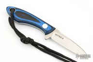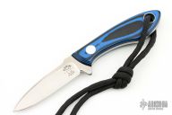 This TK1 by Tom Krein features a high satin finished drop point blade, .107" blade stock and .698" blade depth, full tang construction. The handle has blue/black G10 scales with black liners. Dated 2020. Comes with leather pocket sheath with Mummert clip. Has some light scuffs and scratches, great condition otherwise.