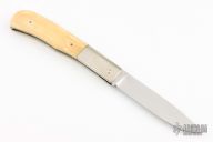 This slipjoint by Dan Burke features mirror finished blade with nail nick. The handle has dovetailed nickel silver bolsters, mammoth ivory covers, fileworked nickel silver liners and stainless steel spring. Has half-stop. Has some light scratches, otherwise excellent condition.