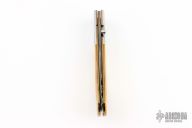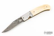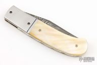 This linerlock folder by Mike Sanders features a Damascus blade with a single thumbstud with mother of pearl inlay. The handle has stainless steel bolsters, gold lip pearl scales over anodized titanium liners and a fileworked aluminum backspacer. Has a few light scratches, otherwise excellent condition.