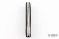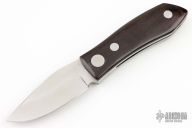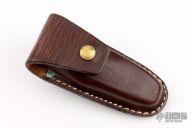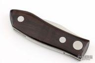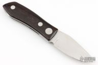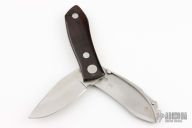 This Barry Wood design swing lock folder features a satin finish blade and satin finish stainless steel frame with wood scales. This is a unique scissor opening folder, which when the blade is fully open and locked in place is almost a fixed blade knife. The handle is nicely contoured for a comfortable grip. Opening is accomplished by lighting pressing down and outward at the rear indentation on the spine, which releases the locking pin and allows one side of the handle and the blade to rotate down then forward until the blade locks in the forward position. The one side of the handle continues to rotate back until it locks in place. Closing requires the same slight thumb pressure at the indentation to release the locking pin, then the one side of the handle is rotated back and around, catching the blade and aligning both with the other side of the handle in a locked closed position. Has some light scratches otherwise the knife is in excellent condition. Comes with a brown leather sheath. No markings other than a "B" scribed inside the knife.