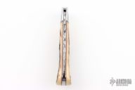 This Lockback by Ray Cover features a hand rub satin finished blade with a nail nick and fileworked spine. The handle has dovetailed stainless steel bolsters, stag covers with nickel silver pins and red liners, stainless steel liners and backspacer. Has a few light scratches, otherwise excellent condition.
