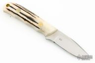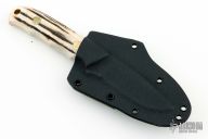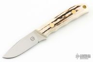 This K-9 Personal Utility by Dozier Knives features a satin finished blade with .126" blade stock and .876" blade depth, full tang construction. The handle has stag scales, brass pins and lanyard hole. Comes with kydex sheath with belt clip. Has a couple light scratches, otherwise excellent condition.