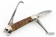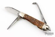 Circa 1900-1915. This tool company was only in business for 15 years. This was a multi-tool before its time. The butt of the knife has a flat screwdriver. Has a pair of pliers with wire cutter, drop point blade and leather awl. The handle has nickel silver bolsters, jigged bone covers, brass liners and steel springs. Has some scratches and patina, otherwise good condition for its age!