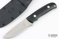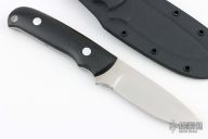 This K-DP by Dozier Knives features a satin finished blade with .132" blade stock and 1.087" blade depth, full tang construction. The handle has black canvas micarta scales with aluminum pins and lanyard hole. Comes with kydex sheath with belt loop. Excellent condition.