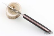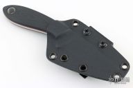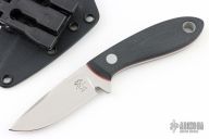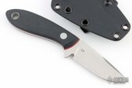 This fixed blade by Tom Krein features a satin finished blade with false top edge, notched thumbrest, .126" blade stock and .912" blade depth, full tang construction. The handle has black G-10 scales with red liners and aluminum pin, and lanyard hole. Comes with a kydex sheath with TekLok. Has some light scratches, excellent condition otherwise.