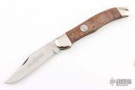 This slipjoint by Queen Cutlery features a satin finished blade with nail nick. The handle has nickel silver bolsters, front and rear, maple wood covers, brass liners and a stainless steel spring. Has some scratches, otherwise good condition.